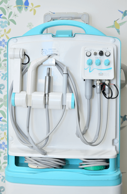 - 歯科医院で使用する治療機器と同等のコンパクトな機器をお持ちしてお伺いいたします。歯科医院で受ける診療と同等の診療が可能です。